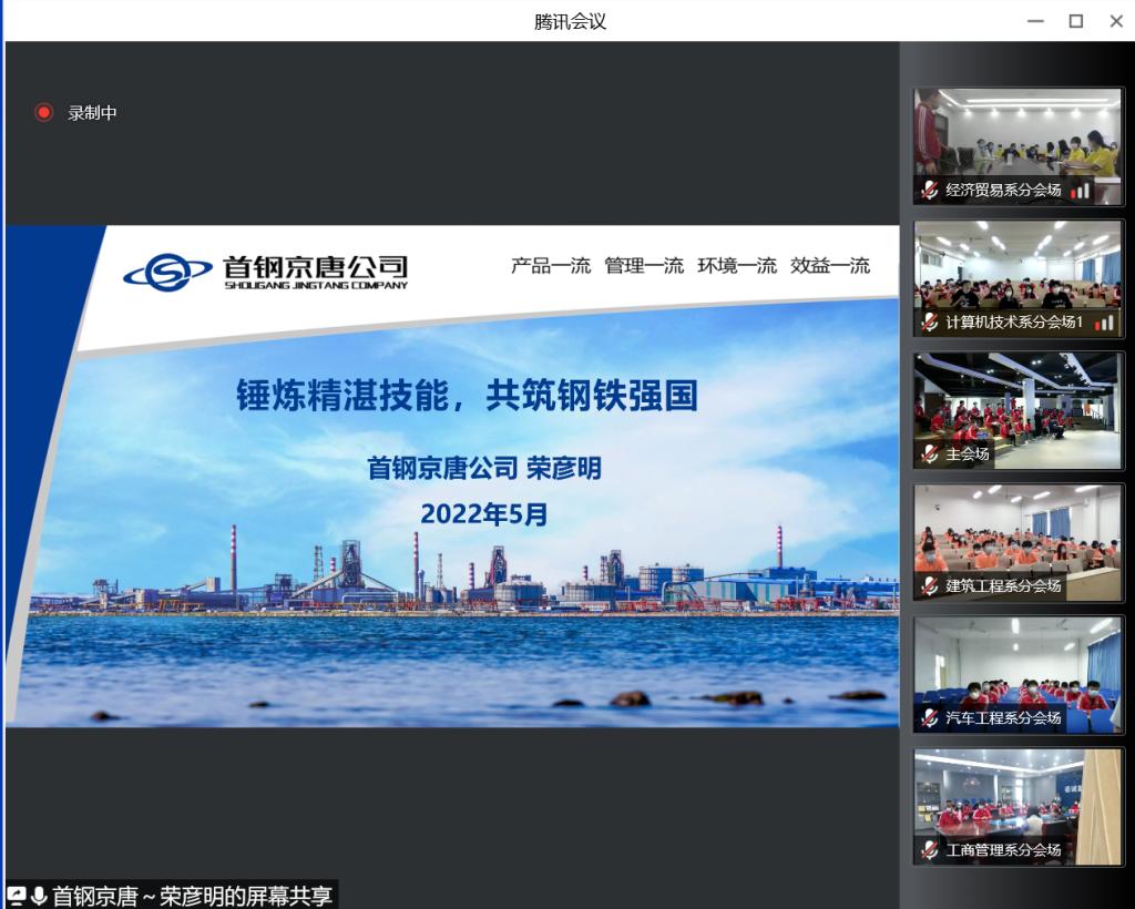 通过线上平台,荣彦明以锤炼精湛技能 共筑钢铁强国”为主题首先进行讲述,从初入职场、苦练技能、执着创新、志愿防疫、悉心帮徒、牢守使命等方面,用专业学习的经验、参加大赛的经历、职场打拼的所悟现身说法,为学弟学妹们传授职场经验、讲解技能提升、诠释劳动精神。并希望大家要树立远大理想,在校期间要努力提升专业知识水平和各方面能力,提前规划生涯目标,保持良好心态,“小我”融入“大我”,为祖国发展贡献力量。讲述完后同学们结合自身主动思考、积极提问,荣彦明学长针对同学们的提问逐一做了详细解答。