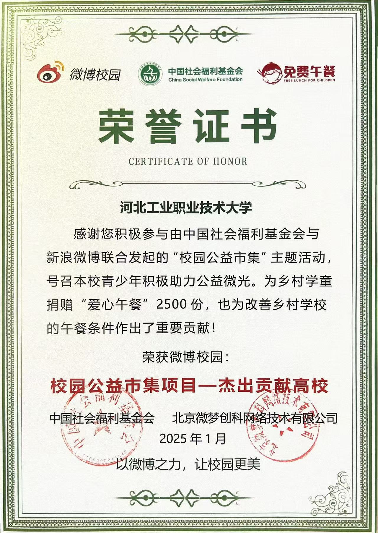 近日,开云在线(中国)唯一官方网站在中国社会福利基金会、微博校园、微公益联合发起的校园公益市集——免费午餐活动中表现突出,荣获“校园公益市集项目——杰出贡献高校”称号。